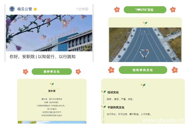 “安职院”文化是发展的文化、创新的文化。“安职院”日新月异的发展变化,是校园文化建设的源头活水。近年来,“安职院”构建了校训理念文化、干部作风文化、师风学风文化、楼宇命名文化、校园景观文化、精神理念文化等“六位一体”的三全育人、山水园林、职教报国的文化体系。从“文明用餐在食堂,不爱网游爱操场;背上书包进课堂,不看手机看黑板”的学风要求到“穿上工装开机床,知行合一见真章;匠心怀德入职场,报党报国报家乡”的学习境界,体现了大学生活的日常规范到职业理想的修炼。如今的“安职院”五个焕然一新的景象正在不断地刷新和深化,这背后的逻辑支撑就是校园文化的深入人心,事业发展的深得民心。