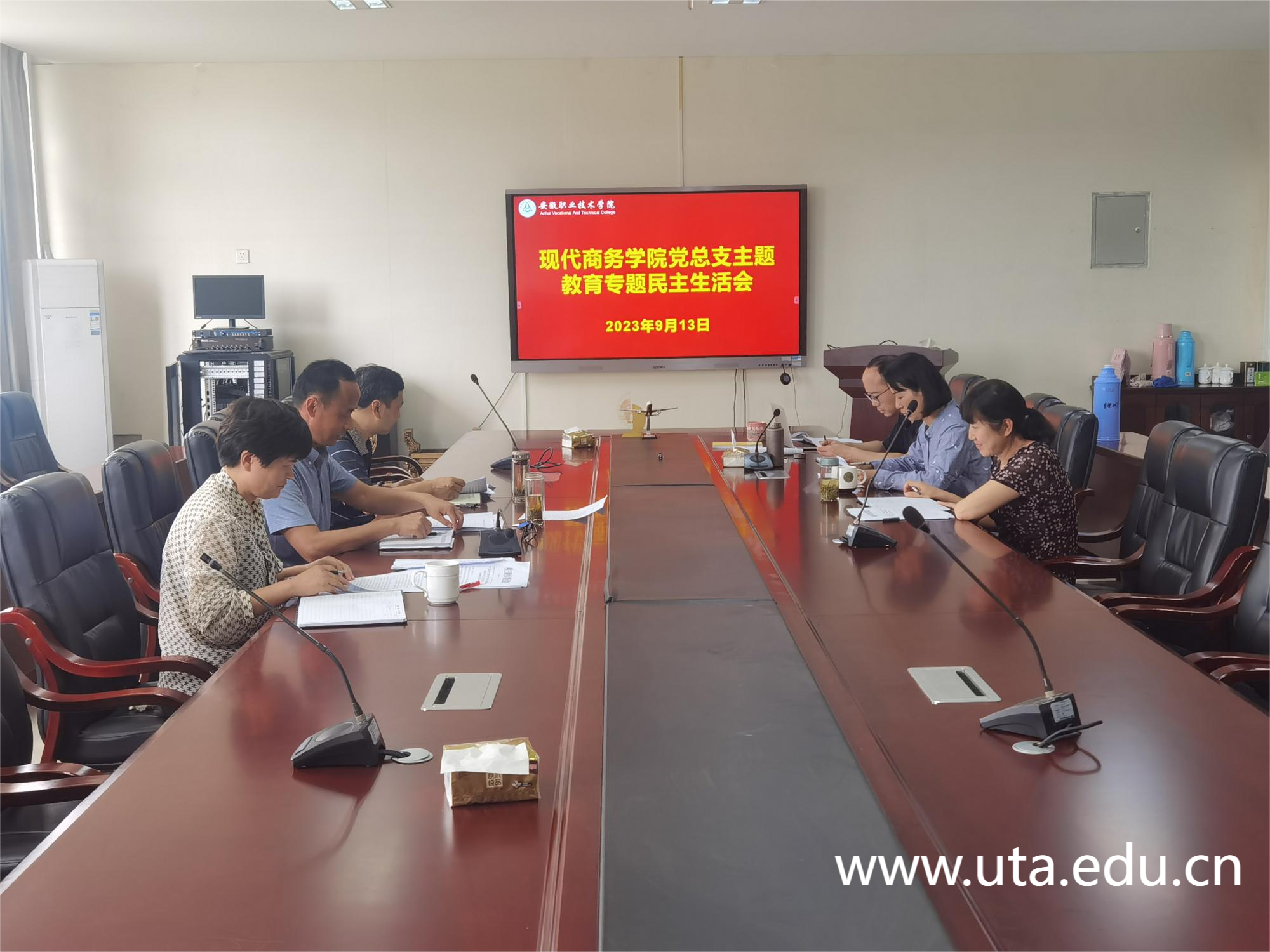 9月13日下午,现代商务学院党总支召开党总支主题教育专题民主生活会。会议以“全面学习贯彻习近平新时代中国特色社会主义思想,深刻领悟‘两个确立’的决定性意义,增强‘四个意识’、坚定‘四个自信’、做到‘两个维护’,团结带领党员干部和广大师生为早日建成高水平职业技术大学努力奋斗,以实际行动推动党的二十大作出的重大决策部署在安徽职业技术学院落地见效”为主题,紧密联系院党总支领导班子和成员工作,认真查摆、深刻剖析,开展批评和自我批评,并提出改进措施,明确努力方向。会议由院党总支负责人许兴旺主持。