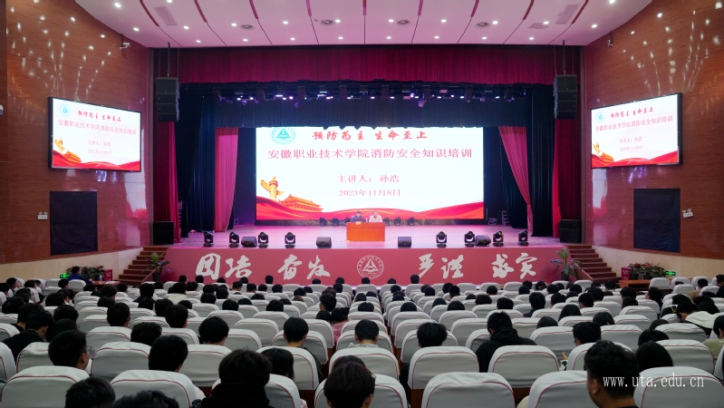 为深入贯彻习近平总书记关于安全生产的重要论述,落实2023年消防安全宣传活动有关要求,进一步增强学院师生的消防安全意识,普及消防安全知识及自救逃生技能,提高师生应对火灾突发事件的能力,11月8日,保卫处举办消防安全知识培训讲座,合肥市新站高新区新海消防救援站班长孙浩受邀开讲,合肥市新站高新区新海消防救援站站长曾燮,保卫处负责人李仿民,办公室、宣传部、教务处、基建处、国有资产管理处、图书馆和各二级学院义务消防员老师、实训员代表、各班级安全委员及寝室长等800余人参加讲座。讲座由保卫处副处长丁琦主持。
