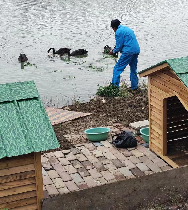 今年8月,校友向我院捐赠了4只黑天鹅,清水湖迎来了一群特别的“新成员”。为了黑天鹅的“安家落户”,后勤管理处提前准备,安排专人学习饲养方法、积累饲养经验,以确保它们能尽早适应新环境。天气渐冷,后勤管理处对清水湖畔进行改造,购置木材,木工自行设计、手工建造了两个舒适的木屋,屋内放置柔软的稻草,并准备了稻谷、配置饲料、蔬菜等喂养食材,为新成员营造了一个温暖、温馨的家。