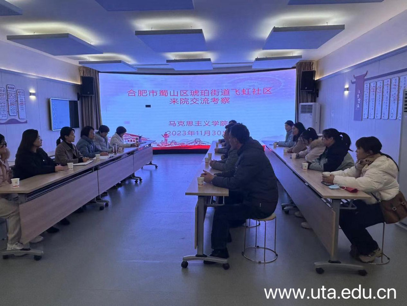 为深入学习贯彻党的二十大精神,推动党建工作高质量发展,11月30日,合肥市琥珀街道飞虹社区党委书记王慧敏、党委副书记段昌九、工作站站长李友一以及社区两委班子成员一行来马克思主义学院开展党建共建活动。马克思主义学院党总支书记钱洁,副院长徐叶、俞海燕,教研室主任石晓慧及部分思政课教师参加活动。