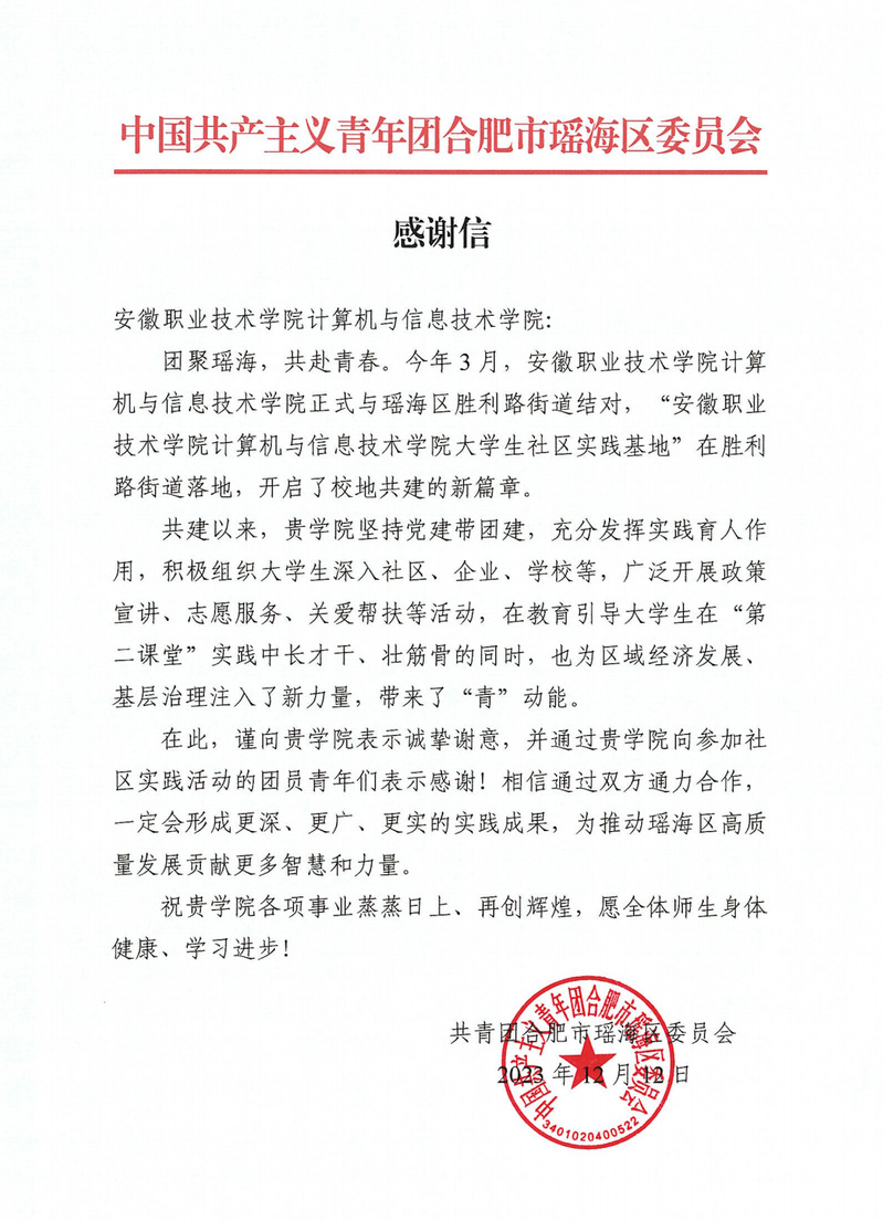 近日,共青团合肥市瑶海区委员会向计算机与信息技术学院致感谢信,信中肯定了合作共建以来,我院师生在志愿服务、基层治理、政策宣讲等方面所做的贡献,并对未来继续深化合作共赢、推动瑶海区高质量发展、助力学院落实立德树人根本任务表达了美好愿景。