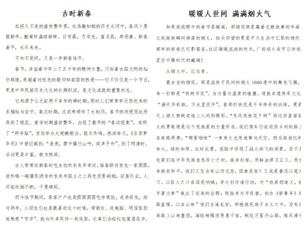 家乡的年味是我们每个人一生的回忆。为传承和弘扬春节优秀传统文化,展示中华文明的精神标识和文化精髓,体现新时代青年的幸福感和自豪感,寒假期间,学院开展了“我眼中的春节”主题征文活动,旅游2323邢欣同学的作品《暖暖人世间 满满烟火气》、文秘2221班赵雪含同学的作品《古时新春》荣获并列一等奖。