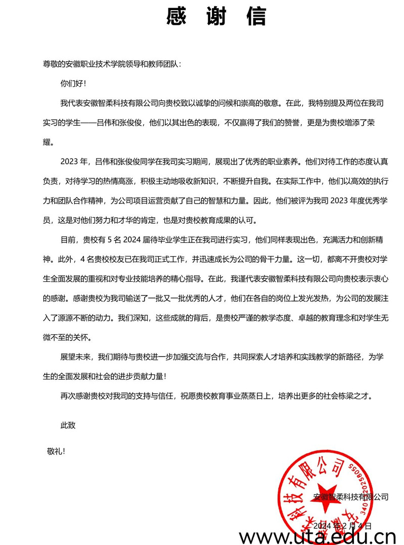 智能制造学院模具2121班吕伟、机电2124班张俊俊在安徽智柔科技有限公司实习期间工作认真负责,积极主动地吸收新知识,以出色的表现,被评为公司2023年度优秀学员。近日,安徽智柔科技有限公司为了表达感谢给我院发来了感谢信。