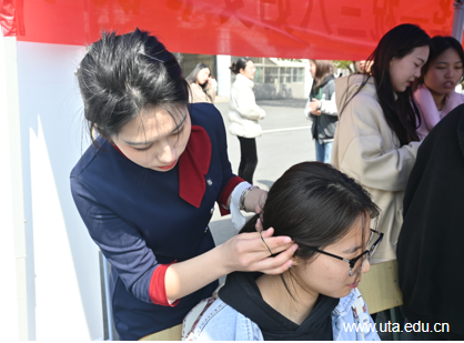此次活动共有技能学习及理论培训两个环节。在技能学习环节中,恰逢“三八”国际妇女节,团委于户外开展了“春风如你 熠熠芳华”礼仪技巧面对面活动,青年艺术中心的同学们现场为大家展示编发技巧及丝巾的佩戴方法,指导操作步骤,帮助同学们掌握技术要领。此外,还结合女同学的不同气质特征及服饰搭配,根据其个性特点和思想实际,量身定制妆发造型,打造“穿搭小课堂”学习阵地,展示出安职学子健康向上、青春昂扬、自信大方的精神风貌。