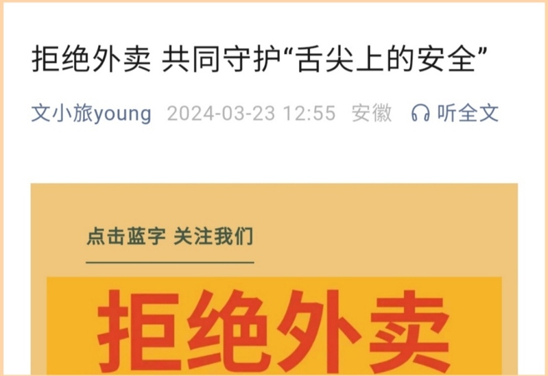 志愿者们通过文小旅young公众号推送“拒绝外卖 共同守护‘舌尖上的安全’”倡议书,倡议同学们改变生活陋习,自觉抵制外卖食品,倡导绿色健康生活,杜绝食品安全隐患。在校园内,志愿者们通过发放宣传单积极向同学们宣传外卖、食用路边小摊贩的危害,呼吁同学们为了自身健康和平安校园建设,要拒绝外卖,尽量在校内食堂或自带餐具打包回宿舍就餐,向全校师生宣传“拒绝外卖 共同守护‘舌尖上的安全’”的理念,以实际行动弘扬和践行雷锋精神。
