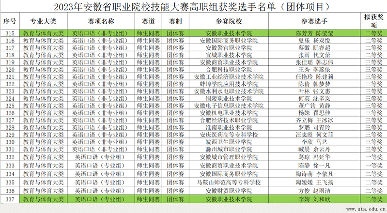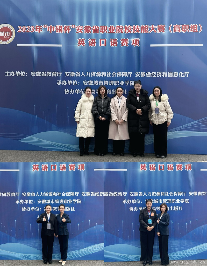 日前,由安徽省教育厅、安徽省人力资源和社会保障厅、安徽省经济和信息化厅联合主办的2023年“中银杯”安徽省职业院校技能大赛(高职组)“英语口语”赛项成绩已公示。外国语学院教师陈芳芳、李婧与其指导的旅游2222班陈莹莹、商务英语2321班刘和欣以扎实的语言素养、沉稳的舞台表现、默契的师生配合分别获得了该赛项非英语专业组和英语专业组省赛二等奖的好成绩。