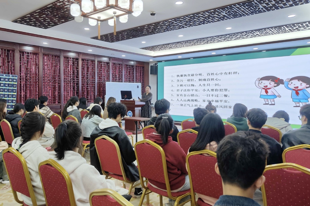 播清廉种子,护清廉花开。为进一步推动清廉安职建设,涵养廉洁文化底蕴,弘扬崇廉拒腐的校园风尚,3月28日,文化与旅游学院在酒店实训室开展廉洁文化主题团课,学院团总支学生会全体成员、各班级团支书、思政委员参与本次团课学习,团课由团总支书记安君主讲。