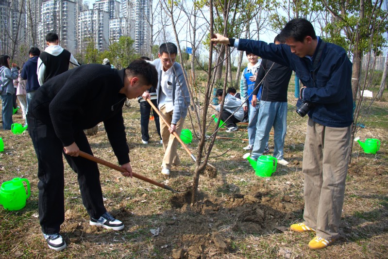 活动当日,阳光正好,学院的师生们来到植树现场,在专业人员的指导下,大家迅速掌握植树要领,有序分工,默契配合。老师们身先士卒,挥锹铲土,每一锹都饱含着对绿色未来的期许;同学们也不甘示弱,有的负责搬运树苗,有的专注于扶苗填坑,还有的提着水桶来回奔波浇水。大家齐心协力,将一株株树苗稳稳地植入土中,现场呈现出一片热火朝天的劳动景象。经过师生们的辛勤劳作,原本空旷的土地上整齐地排列着新栽的树苗,它们在微风中轻轻摇曳,焕发出勃勃生机。这些树苗承载着智能制造学院师生对绿色未来的美好憧憬,也将成为他们参与生态文明建设的生动见证。
