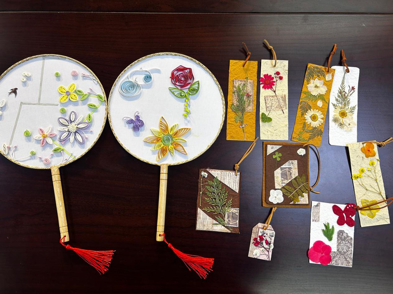 活动现场,折纸书签、衍纸等充满趣味的手工项目有序开展,搭建起学生们接触文化创意的桥梁。同学们自行领取衍纸教程手册与手绘模板,迅速投身到折纸干花书签及衍纸团扇的创作中。大家热情高涨,依据个人喜好自主挑选项目,充分发挥自身创意。彩色卡纸在他们手中灵活翻飞,转眼间变成娇艳花瓣、灵动蝴蝶;干花与彩纸经巧妙构思,拼凑出饱含春意的独特书签;衍纸工艺更是让细长彩纸卷摇身变为精巧的立体图案。大家沉浸其中,在实践过程中自发交流创作思路,相互启发灵感,整个活动现场,欢声笑语不断,洋溢着轻松且活跃的氛围。