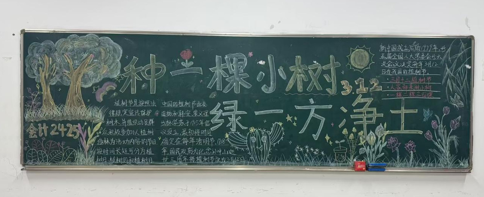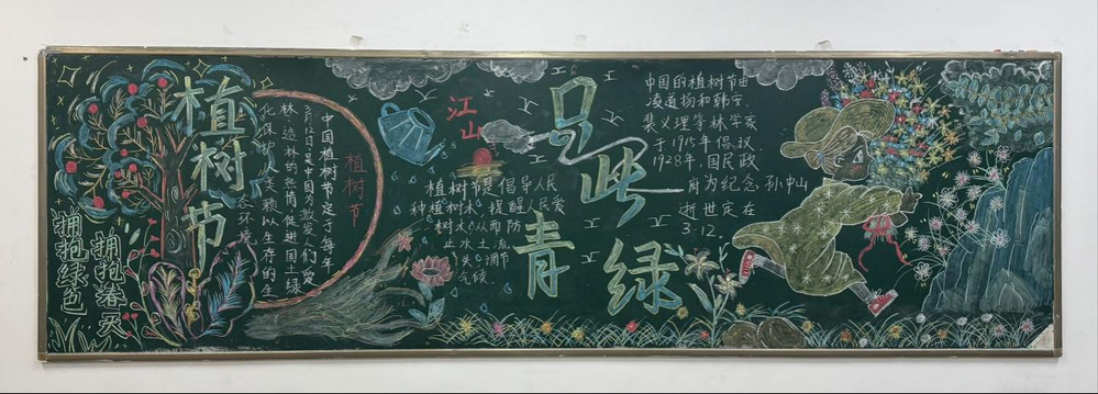 本次活动以画笔为媒,号召青年学子用色彩诠释绿色发展理念,为校园注入盎然生机。自活动启动以来,各班级围绕活动主题并结合植树节的历史意义、生态保护知识及校园环保实践展开创作。黑板报内容丰富多彩,既有对植树节意义的深刻阐释,也有对春天生机勃勃景象的生动描绘,更有对绿色环保行动的呼吁。同学们用五彩斑斓的粉笔勾勒出春天的美好,用文字传递出对环境保护的责任与担当。