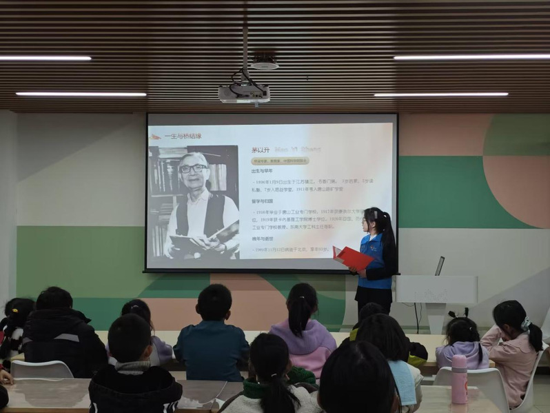 活动伊始,志愿者向孩子们宣讲了茅以升的生平事迹:从立志造桥的少年梦想,到主持建造中国第一座现代化大桥——钱塘江大桥,茅以升克服重重困难,凭借坚定的信念和卓越的智慧,为我国桥梁事业立下不朽功勋。孩子们聚精会神,不时发出惊叹,被茅以升先生为科学事业不懈奋斗的精神深深打动。