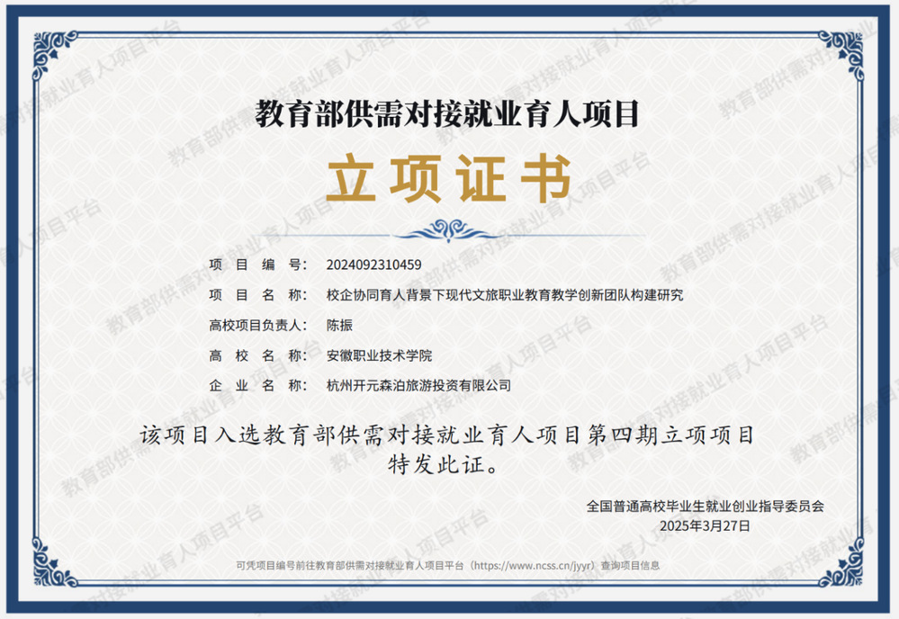 近日,教育部公布了2024年教育部供需对接就业育人项目立项名单,《校企协同育人背景下现代文旅职业教育教学创新团队构建研究》成功获得立项。