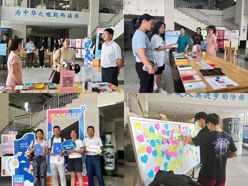 活动期间,图书馆在一楼大厅设置了多个活动区域,整体氛围热烈而有序。在扫码关注区,大量新生积极参与,馆员与馆内管理员协助他们关注图书馆官方公众号,并介绍开放时间、借阅规则等基本服务,还根据各自专业推荐相关电子资源,帮助其快速熟悉学术工具。大厅内同时陈列电子资源介绍展板与新书推荐架,直观展示馆藏资源,便于新生自主了解。梦想留言板成为新生表达大学目标与成长期待的窗口,他们写下对学业、职业和自我的规划,展现出积极向上的精神风貌。拍照打卡区则捕捉了许多温馨时刻,无论是新生的自信笑容,还是家长的欣慰与期许,都为本次活动增添了温暖与意义。