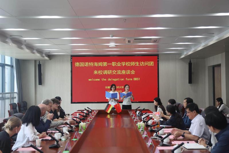 盛鹏代表全校师生对德国来宾表示热烈欢迎。在致辞中,他回顾了多年来在安徽省教育厅的指导下,两校友好互访的悠久历史,希望两校能够进一步加强合作,中德师生间形成更加积极、有效的互动,深化两校师生交流与合作。德国BBS1副校长Sven Tammen致辞,回顾了两校友好交往的历史,希望未来两校之间能够长期开展更深层次的交流合作。