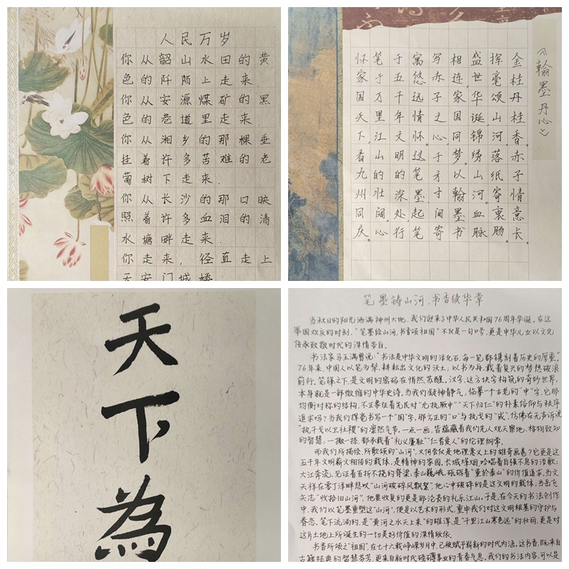 为激发学生的爱国热情与文化自信,学院在双节期间开展“我心中的祖国”书法征文比赛。比赛得到了同学们的积极响应,大家围绕“歌颂祖国成就”“传承中华文化”“青春与祖国同行” 等主题,用笔墨书写对祖国的热爱,用文字抒发对未来的憧憬。