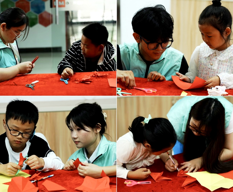 活动前,志愿者们备好红纸、剪刀、铅笔等工具,提前到场布置场地,耐心调试教学设备,以饱满的热情迎接小朋友们的到来。理论讲解环节中,志愿者们化身小老师,向小朋友们讲解传统剪纸艺术的由来和发展,激发了创作兴趣和民族自豪感。