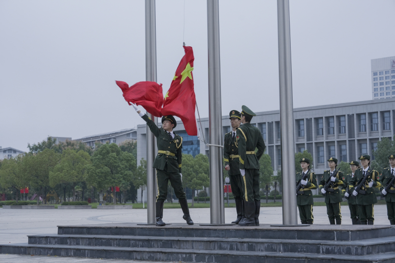 晨光初照,国旗护卫队队员身姿挺拔,迈着整齐划一的步伐护送五星红旗走向升旗台。伴随着雄壮激昂的国歌声,升旗手振臂挥旗,鲜艳的五星红旗冉冉升起。全体师生肃立注目,高唱国歌,心中涌动着对祖国的无限崇敬与热爱。