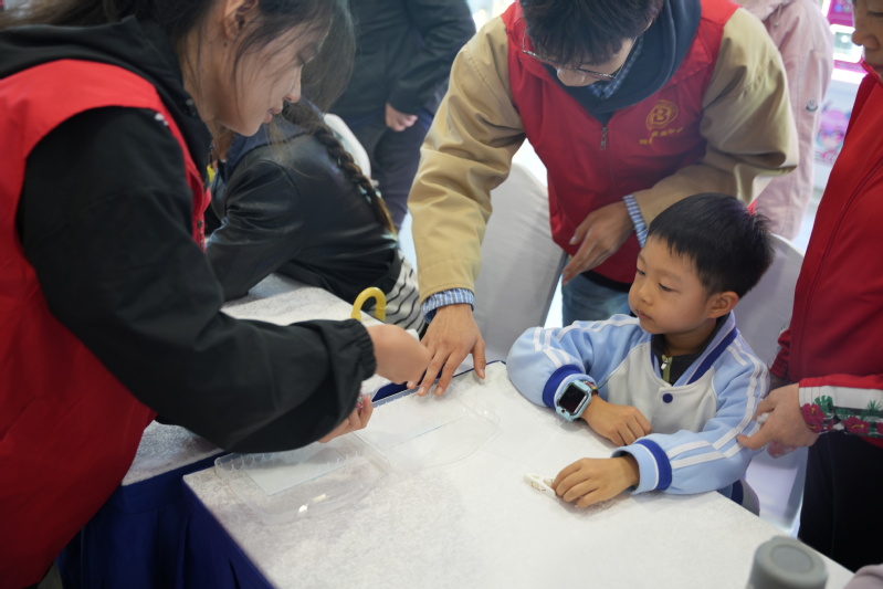 其中,一架航天模型格外引人注意,洁白主体搭配蓝色线条,还有小国旗、小宇航员和彩球“星球”,仿佛在演绎太空探索场景。经了解,小创作者自小怀揣航天梦,渴望乘飞船探索宇宙。志愿者随即拿出宇宙科普绘本,为围拢的孩子讲解星云知识,现场成了热闹的“迷你宇宙课堂”。