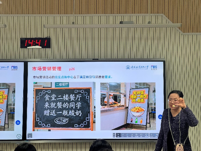 本次公开课的章节为“市场营销管理哲学及其演进”。崔老师以其扎实的专业功底和丰富的教学经验,从基础理论切入,结合当下市场环境中涌现的新颖案例,深入浅出地引导学生理解营销哲学的演变脉络。崔老师注重启发学生思维,巧妙指引学生运用商科智慧分析与解决现实商业问题,课堂气氛活跃,师生互动频繁。同时着重课堂思政,“诚信”的经营之本、“国货品牌的崛起”背后的文化自信、“质优价实”的市场逻辑以及企业家的“良心与底线”等关键词被反复强调,不仅深化了学生对营销伦理的认识,更在潜移默化中培养了学生的职业素养与社会责任感。参与听课的教师们纷纷表示,教学设计精巧,内容充实,思政融入自然贴切,为他们提供了宝贵的教学思路与借鉴,收获颇丰。
