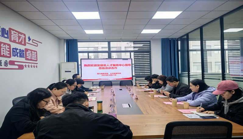 10月21日上午,安徽省人才服务中心副主任田文琦、安徽省大中专毕业生就业指导中心发展培训部部长刘斌一行4人来我校洽谈安徽省首届直播带岗业务技能比武活动,会议在公共管理学院至朴楼三楼会议室召开。现代商务学院院长杜淑琳,公共管理学院党政负责人王冬梅、朱凤丽,副院长王家祥及两个学院教师代表参会。