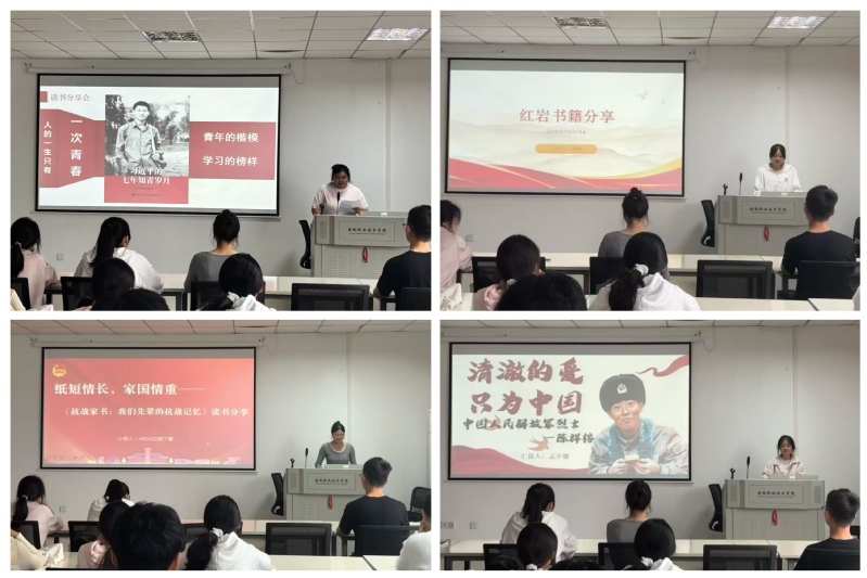 随后,HR2422班的随子馨同学带来《抗战家书》的分享。她选取书中几封极具代表性的家书,逐字逐句解读字里行间的深情:有战士对父母“勿念儿身”的牵挂,有革命者对妻子“待胜利归来”的承诺,更有仁人志士对祖国“必保山河无恙”的誓言。这些跨越时空的文字,让同学们真切触摸到革命先辈在战火纷飞中,一边是对家人的柔肠,一边是对信仰的坚守,深刻体会到“家国大义”的千钧分量。HR2422班的王璐瑶同学以经典著作《红岩》为切入点,将书中“江姐”“许云峰”等英雄人物的故事娓娓道来。她重点讲述了一代青年革命者如何在黎明前的黑暗中,将个人理想与民族解放的命运紧紧相连,用鲜血与生命诠释“信仰”的真谛。“如果信仰有颜色,那一定是中国红”,王璐瑶的这句话引发全场共鸣,让同学们深刻认识到,如今的和平生活正是无数英雄用牺牲换来的宝贵馈赠。HR2422班的孟夕璇同学分享《陈祥榕》一书,将视角聚焦于新时代英雄。她从陈祥榕“清澈的爱,只为中国”的日记入手,讲述了这位年轻战士在边境冲突中,用生命守护祖国领土的动人故事。孟夕璇提到,陈祥榕的事迹虽没有惊天动地的宏大叙事,却在“想爸妈,但更想保家卫国”的朴实话语中,展现出共产党人代代相传的初心与使命,让同学们懂得“英雄从未远去,信仰就在身边”。