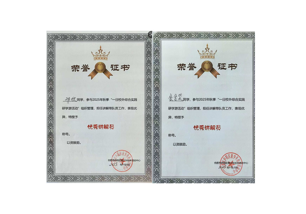 近日,合肥市庐阳区青少年校外活动中心向文化与旅游学院发来荣誉证书,表彰旅游管理专业邢欣、金含笑两位同学,在2025年秋季“一日校外综合实践研学游活动” 中表现突出,荣获“优秀讲解员”称号。