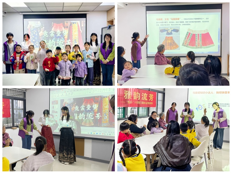 活动中,志愿者以生动语言讲解了马面裙的历史演变与结构特色。从宋元雏形到明清盛行,从对称裙门到精致纹样,孩子们在图文并茂的展示中领略到传统服饰的匠心之美。随后的快问快答环节气氛热烈,孩子们踊跃参与,在互动中加深了对马面裙知识的理解。最后,志愿者们身着各色马面裙惊艳亮相。孩子们纷纷表示“马面裙太美了”。