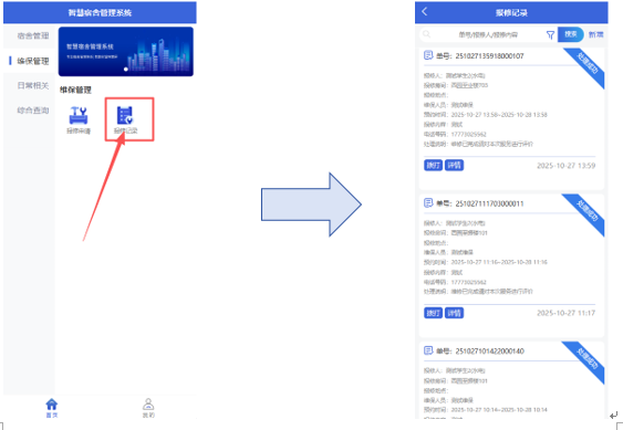 在“报修记录”中,查看维修单进度或对处理完成的维修单进行评价。