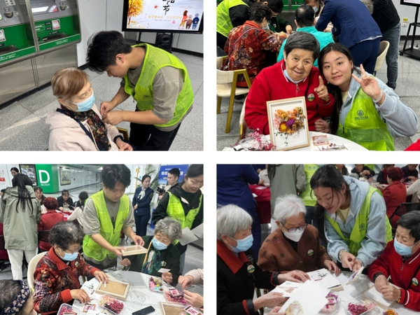 非遗体验区内,志愿者们化身文化传承的年轻使者,与老人们共同制作干花贴画。同学们细致讲解步骤、耐心辅助操作,长者们则巧手粘贴、悉心布置,片片秋意在指尖流转成画。代际之间的默契协作,不仅让传统非遗焕发出新的活力,也在互动中织就了温馨难忘的重阳记忆。