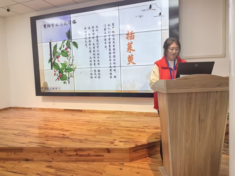 互动环节内容丰富,以“青春年少好读书”为主题,涵盖经典诵读、书籍推介与知识答题三个板块。在诗词诵读环节,小朋友们齐声朗诵《九月九日忆山东兄弟》等经典诗作,在朗朗书声中体会古人的节日情怀,感受诗词中的深厚文化韵味。随后向小朋友们推荐了《了不起的中华民族》与《非遗中国》两本读物。前者以绘本形式解读中华习俗、艺术等文明成果,语言浅显易懂且配有国风插画;后者则涵盖传统节日等非遗项目,帮助大家从不同视角了解传统文化的传承价值。知识答题环节中,志愿者围绕重阳节历史、习俗、诗词等内容设计选择题与判断题,小朋友们踊跃举手抢答,在欢乐互动中巩固所学知识,深化对传统文化的理解与喜爱。