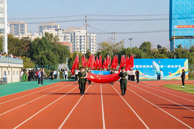 升旗仪式庄严举行,全场肃立,国歌嘹亮。盛鹏在开幕辞中号召全体运动员团结协作、坚韧拼搏,在赛场上挥洒汗水、超越自我,并提出三点期望:运动员要尊重规则、赛出水平,在拼搏中收获成长;裁判员须恪守公平、公正执裁,维护赛场秩序;全体师生应文明观赛、热情喝彩,共筑温情体育盛会。李方泽郑重宣布:“安徽职业技术大学第一届运动会——开幕!”顷刻间,掌声与欢呼交织如乐,将现场气氛推向高潮。