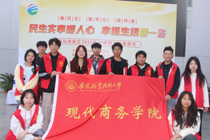 11月15日下午,现代商务学院志愿者队伍走进新站高新区瑶海社区勤劳社居委活动广场,以“民生实事暖人心 幸福生活新一站”为主题,积极参与2025年30项民生实事宣传志愿活动,用青春行动架起政策与群众的“连心桥”。