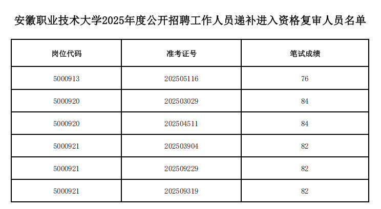 根据《安徽职业技术大学2025年度公开招聘工作人员专业测试及有关工作实施方案》,岗位编号5000913、5000920和5000921因考生资格复审未通过或放弃资格复审等原因,导致出现人选缺额。现依据笔试成绩,从高分到低分依次等额递补(笔试成绩须达到最低控制合格分数线)。若最后一名出现多名考生笔试成绩相同情况,则一并进入资格复审环节。