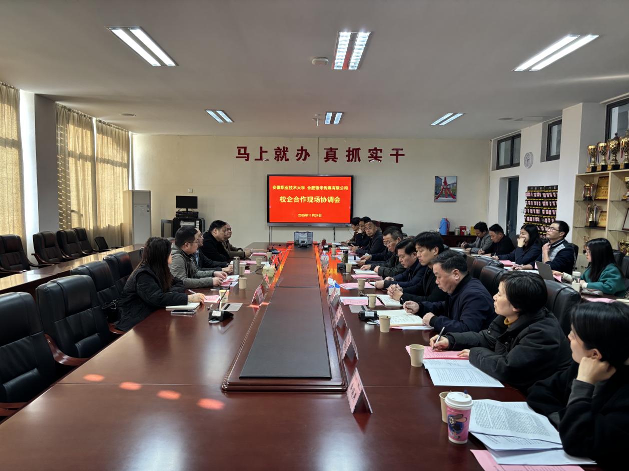 本网讯(现代商务学院)为深化产教融合,推动校企合作走深走实,11月24日,我校与合肥微米传媒有限公司共同召开校企合作现场协调会。校领导宣岩松,校教育发展基金会秘书长林葆春,合肥微米传媒有限公司董事长王多林、总经理江涛,学校有关职能部门、二级学院等单位负责人,微米公司相关负责人等出席会议。会议由办公室负责人主持。