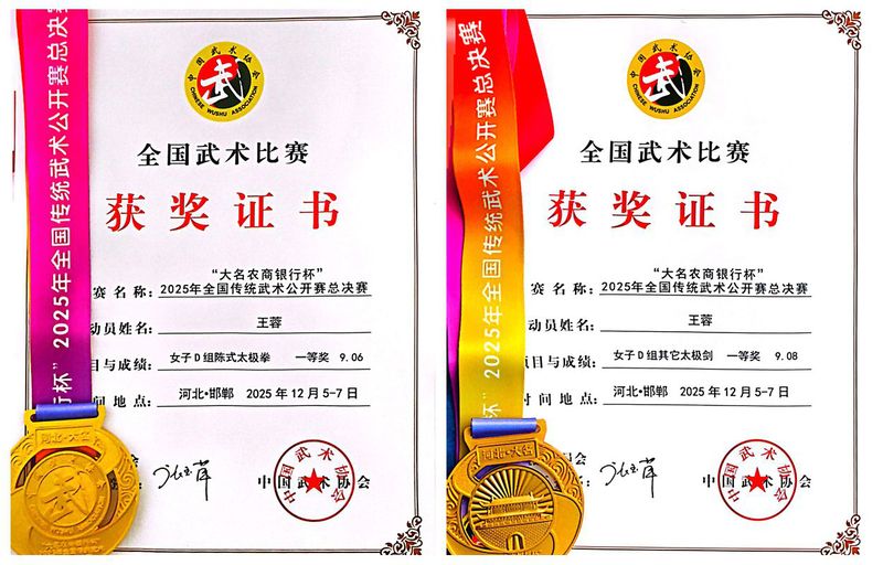 12月5日至7日,2025年全国传统武术公开赛总决赛在河北邯郸举行,我校老年大学健身太极、健身气功班教师王蓉代表安徽省出征,在高手云集的角逐中脱颖而出,一举斩获女子D组陈式太极拳、女子D组其他太极剑两块金牌,为安徽传统武术事业书写下亮眼一笔。