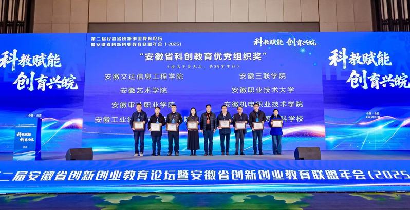 本网讯(就业与创新创业指导中心)12月20日至21日,第二届 “安徽省创新创业教育论坛”暨2025年安徽省创新创业教育联盟年会在合肥成功举办。本次会议审议并正式公布了2025年度全省科创教育系列评选结果,我校凭借在创新创业教育领域的扎实深耕与突出成效,成功斩获 “安徽省科创教育优秀组织奖”。这一荣誉的获得,是对学校长期以来积极推进双创教育、精准服务地方产业发展的高度认可与充分肯定。