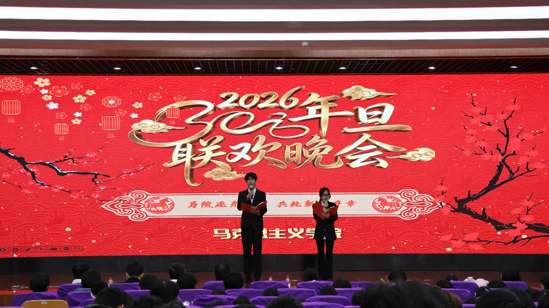 为迎接奔腾马年,丰富校园文化生活,厚植师生家国情怀与集体凝聚力,12月23日晚,马克思主义学院于图文信息中心三楼报告厅成功举办了2026年元旦晚会暨表彰大会。学院党总支书记钱洁与学院师生代表欢聚一堂,在歌舞与欢笑中迎接新的一年。