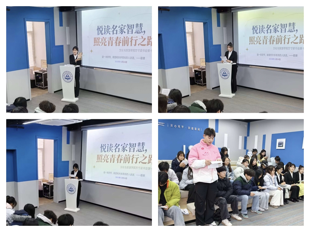 12月24日,文化与旅游学院第十一期方寸读书会如期举办。本次读书会以经典文本为媒,汇聚青年学子共赴书香之约,在思想碰撞中感悟人生智慧,在交流分享中汲取成长力量,让冬日校园洋溢着浓厚的文化氛围。