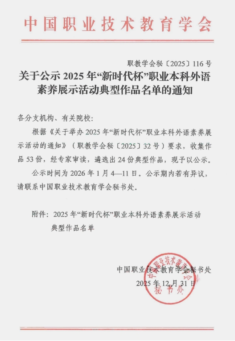 “新时代杯”职业本科外语素养展示活动是全国职业本科院校交流教学成果的重要平台,启动后广受院校关注。此次入选是我校首次参与该全国性赛事便斩获的重要成果,既是对师生付出的充分肯定,也是学校“以赛促教、以赛促学、以赛促改”育人理念的生动实践,集中体现了我校在职业本科人才培养与实践教学改革中的突出成效。
