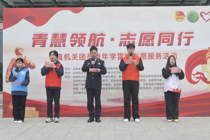 本网讯(团委)三月江淮春潮涌,雷锋精神薪火传。3月5日下午,在全国第63个“学雷锋纪念日”与第27个“中国青年志愿者服务日”到来之际,由安徽省直机关团工委主办,安徽职业技术大学团委、安徽省公安厅机关团委联合承办的省直机关团员青年“青慧领航·志愿同行”学雷锋志愿服务活动在我校顺利举办。省科技厅、省气象局、安徽青年报、安徽广播电视台、合肥市消防救援局、合肥市公安局等20余家单位的青年骨干与我校千余名师生共聚现场,以实际行动传承雷锋精神,践行志愿服务理念。