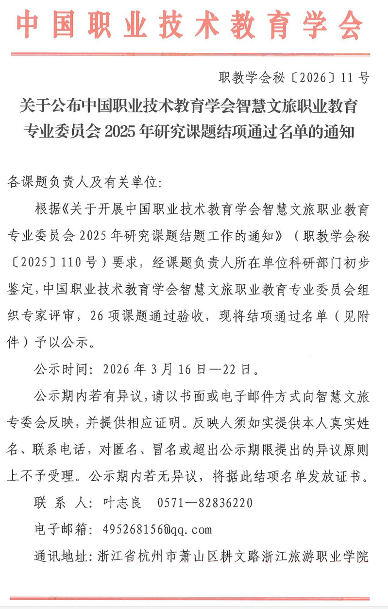 此次课题顺利结项,是对旅游管理教学创新团队科研实力与教学改革实践成效的充分肯定。研究成果不仅为职业教育教学关键要素改革在文旅专业领域的落地提供了可操作的参考,也为现代职业教育体系建设贡献了实践经验。课题研究过程中形成的校企协同育人机制、模块化课程体系、数字化教学资源等成果,有效提升了人才培养质量与服务产业能力。