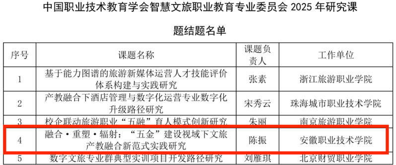 近日,中国职业技术教育学会公布了2025年智慧文旅专委会研究课题结题通过名单。文化与旅游学院旅游管理教学创新团队主持的《融合·重塑·辐射:“五金”建设视域下文旅产教融合新范式实践研究》经专家评审,顺利结项。