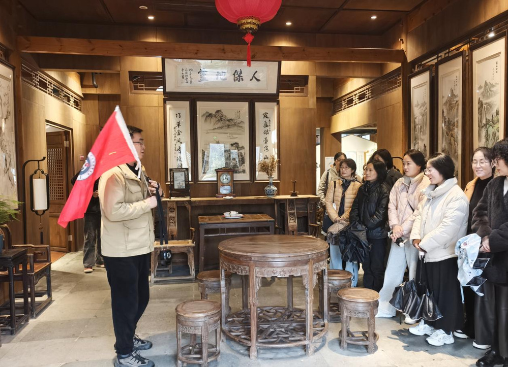 活动首站抵达山口凌村的乡建学堂。这处由旧小学改造而成的文化交流空间,不仅是建筑的再生,更是乡村建设理想的实践载体。透过学堂的窗,女教师们深入了解了这座始建于明末清初的古村落那“九龙攒珠”的独特布局与历史文脉。漫步于青石板路,大家切身感受到乡村振兴战略如何为沉寂的百年古村注入新的生命力,使其蝶变为集文化浸润、生态观光、休闲度假于一体的微旅行目的地。随后,大家参观了由旧民居匠心改造的徽派主题民宿。在这里,质朴的木质结构与黛瓦相映成趣,传统美学与现代舒适相得益彰,女教师们不仅领略了乡土建筑活化利用的精妙,更在“悠然见南山”的意境中,触摸到了乡村振兴的生动样本。