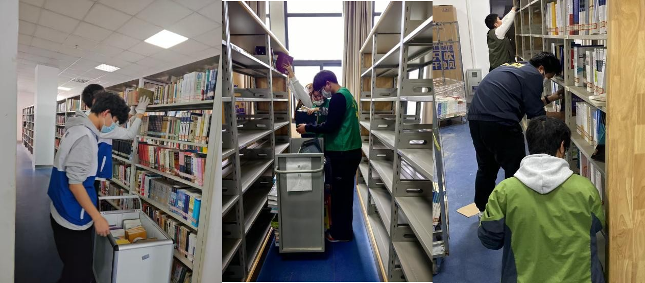 在图书馆典藏(一二)书库的工作中,图书馆老师通过现场指导,学生团队以科学流畅的“流水线式”作业,将图书馆典藏(一二)书库内铁制书架上的书籍调整至图书馆环境优化项目前期准备好的木质包边书架上。