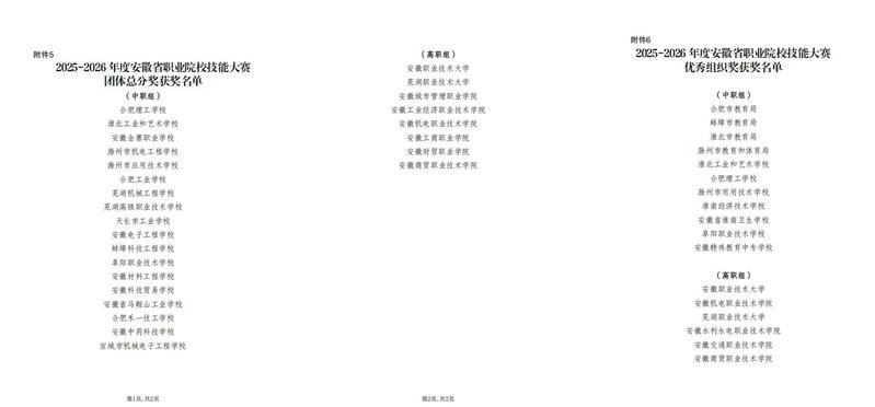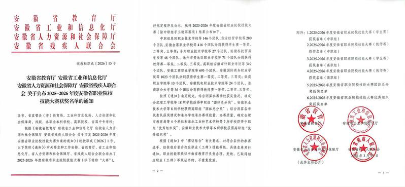 本网讯(教务处)日前,安徽省教育厅等四部门联合公布了“2025-2026年度安徽省职业院校技能大赛获奖名单”。我校在此次省赛中表现亮眼、成果丰硕,共派出167支学生代表队、8支教师代表队参赛,最终斩获各类奖项121个,其中一等奖33个、二等奖45个、三等奖43个,同时摘得全省高职组团体总分奖第一名,并荣获优秀组织奖,用实力彰显了我校职业教育的办学水平与育人成效。