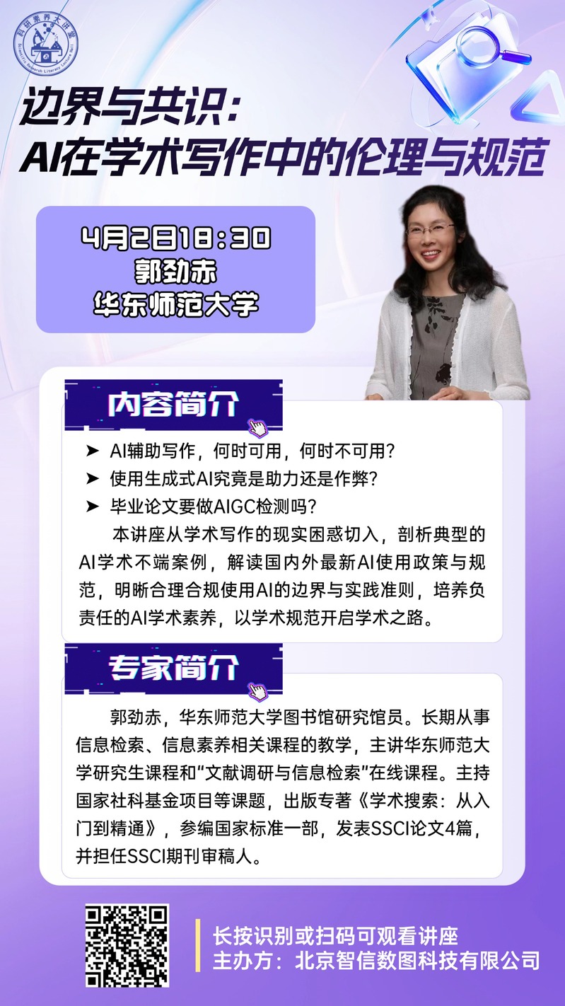 随着生成式人工智能技术的快速发展,AI辅助写作在学术研究中的应用日益广泛,同时也带来了关于学术伦理与使用规范的诸多思考。为帮助我校师生正确认识并合理使用AI工具,提升负责任的学术素养,图书馆特组织全校师生参加华东师范大学郭劲赤研究馆员的线上专题报告。现将有关事项通知如下: