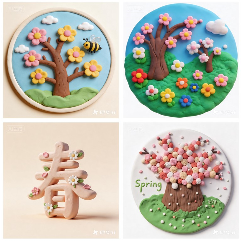 活动现场,计算机与信息技术学院学生志愿者首先为大家演示了AI绘画工具即梦的基本操作。同学们只需输入“春日”“樱花”“新绿”“暖阳”等关键词,系统便能快速生成风格各异、色彩丰富的春日场景图像。这些由算法生成的视觉素材,为黏土创作提供了直观的配色参考和造型灵感。