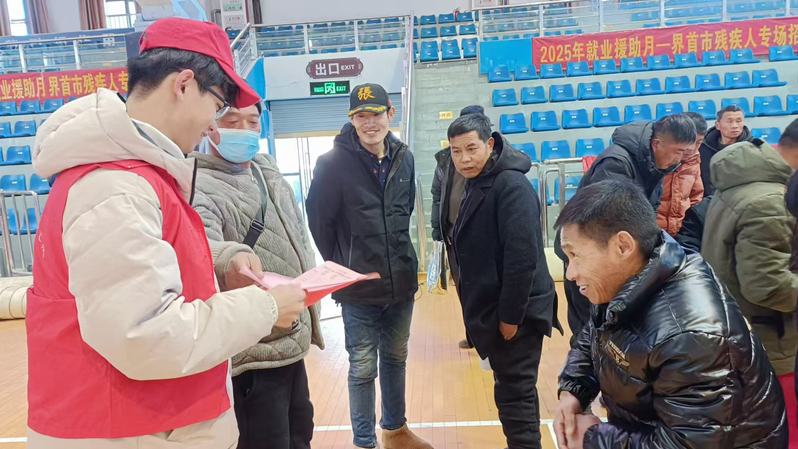 在2025年1月界首市“接您回家”暨就业援助月残疾人专场招聘会上,赵未时作为大学生志愿者全程参与,面带微笑耐心引导每一位求职者,细致解答就业政策,精准推介岗位信息。他的专业与真诚,为现场营造了贴心友好的氛围,也展现了新时代大学生“奉献、友爱、互助、进步”的志愿精神。