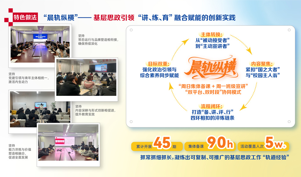 “晨轨纵横”集体备课会与主题晨会,是我校推动学生思想政治教育常态化、机制化、品牌化的重要抓手之一。自2024年10月启动以来,活动以“每周一主题、每周一班级、每周一循环”为运行准则,构建起“周日集体备课+周一主题晨会”的“双平台、双时段”协同育人模式。各班级团支书实行轮流主讲,在学院党总支负责人、团总支书记和辅导员的全程指导下,完成“备、讲、评、行”四环相扣的能力淬炼链条。